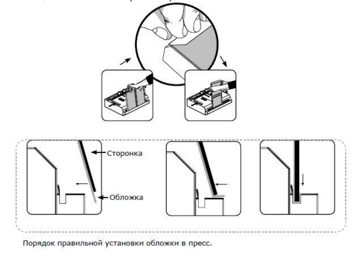 • Сначала загните и припрессуйте клапана длинной стороны обложки. Вставьте обложку в пресс так, чтобы она обтягивала сторонку (см рисунок ниже).